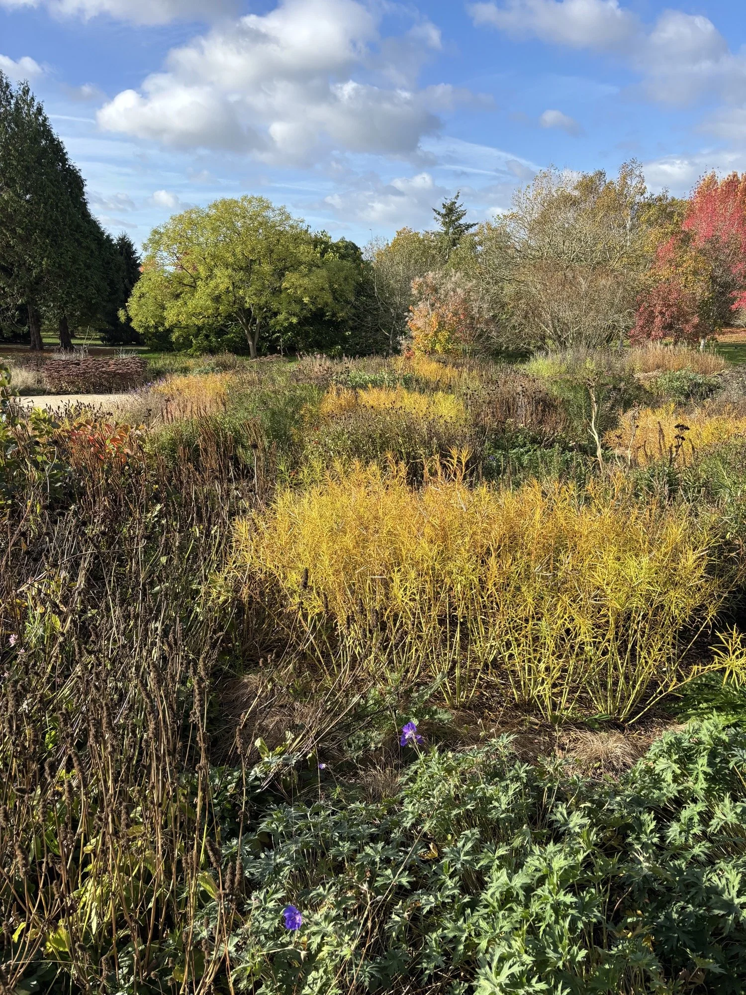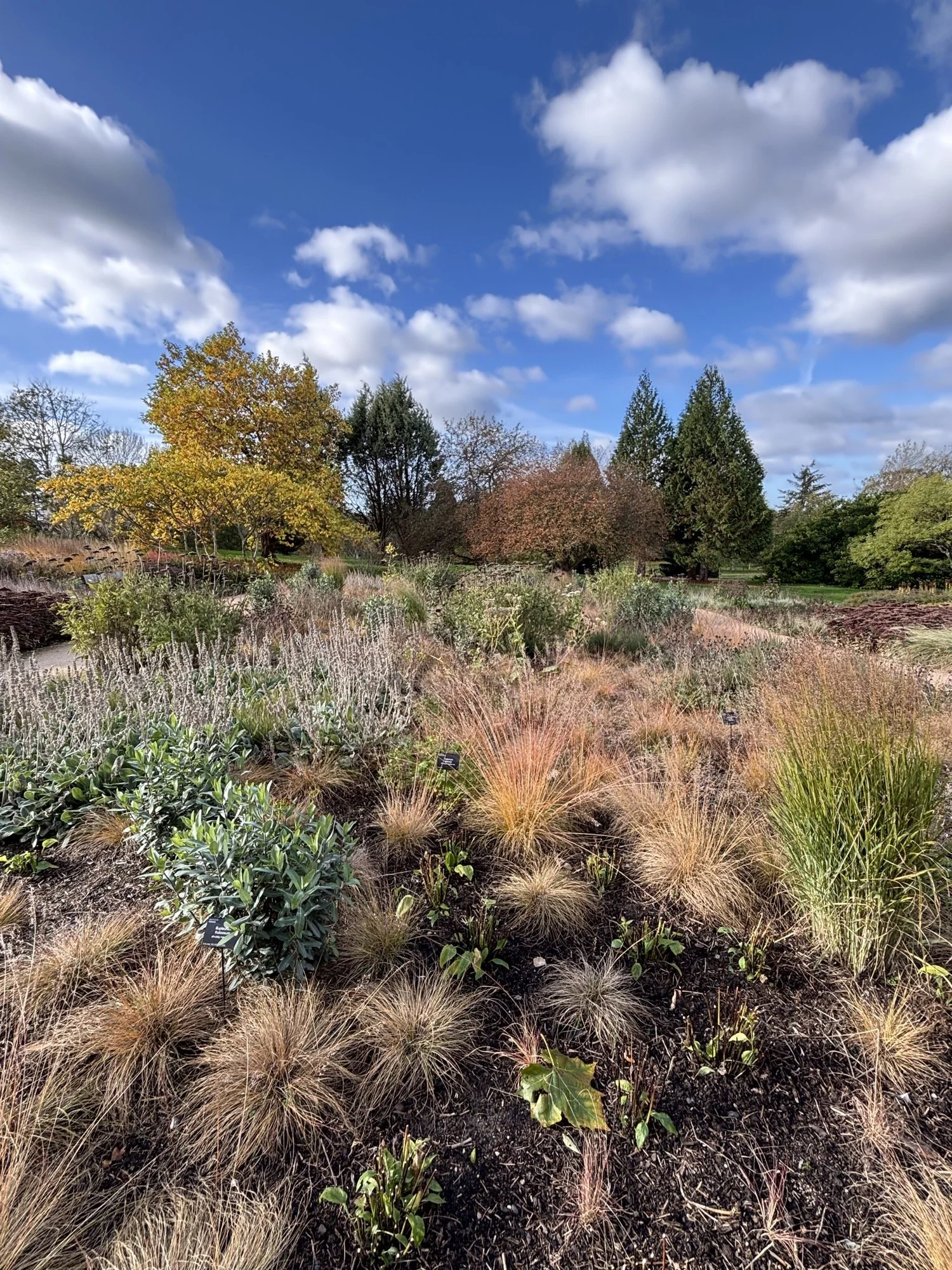 It’s everything I want in a garden — sustainable, good for pollinators, colour all year. And yet — it just didn’t deliver for me. I was so disappointed, to be honest. I know it’s October and it’s relatively new, but I was still hoping for so much more. I wanted a variety of height — that’s what I associate with perennial planting. I wanted a variety of textures (I got that to a certain extent), and I still wanted colour in October. The only real colour came from the trees in the neighbouring parts of the garden. The promise of the information board wasn’t realised for me. Whilst it’s meant to be good for pollinators, I couldn’t help thinking: why isn’t there a pond here?