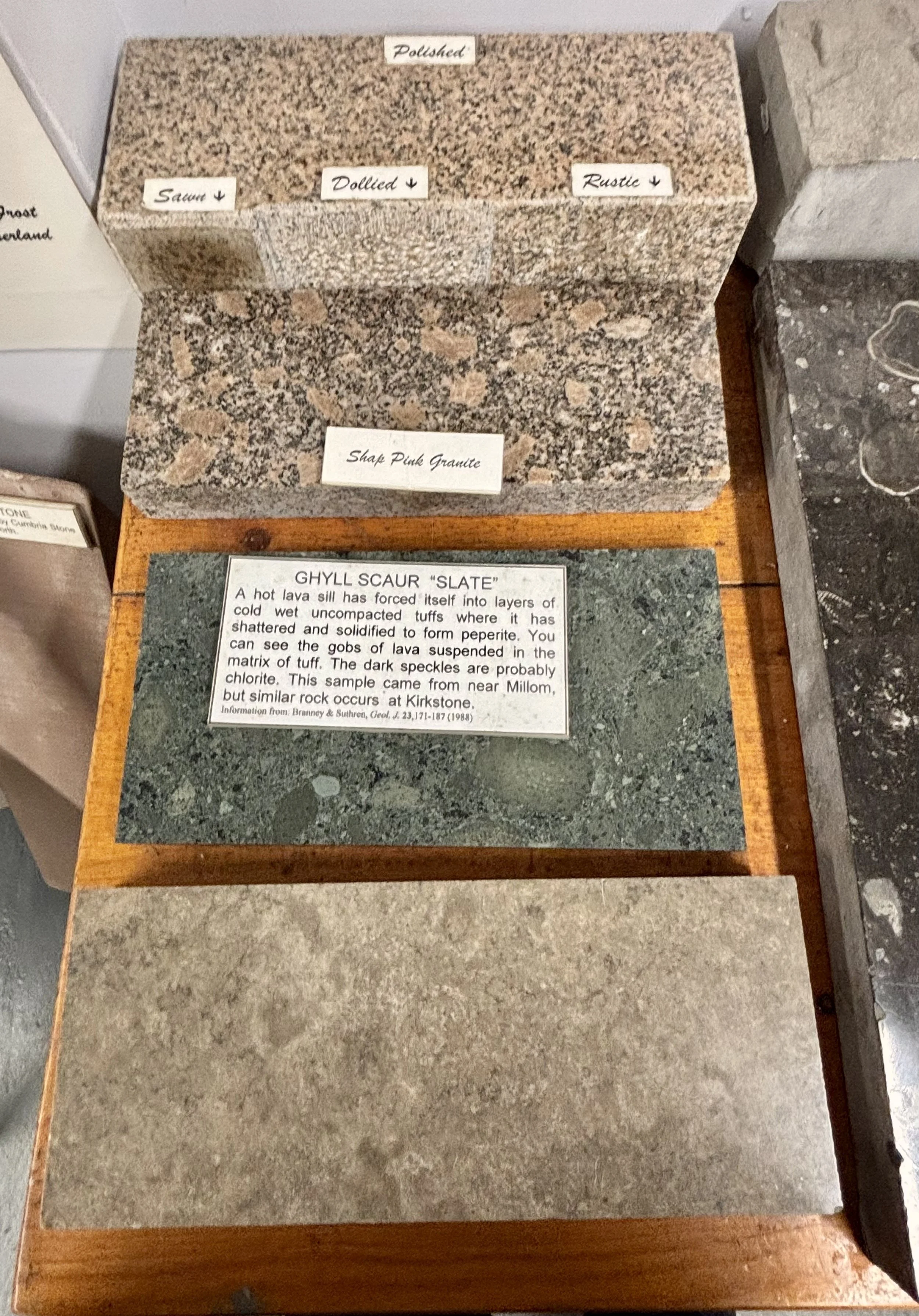 But geology is a massive topic so today I just want to focus on one rock which is the one we went to see at the quarry behind the mining museum. It might seem strange to have a favourite rock - but I do. And it’s granite. That is probably because it is the predominant rock found in the south west of England, in a place which is very special to me. The Cornish granite is black and white with huge crystals of quartz and feldspar and is either rough and angular or been worn into smooth pebbles by the sea. Either way, it sparkles and glistens and is just a joy to hold and look at. When I moved to Cumbria I came across Shap Granite. This is a very special rock because the feldspar crystals are pink - it’s really very unusual and beautiful. Granite takes a polish very well so, unsurprisingly both Cornish and Shap granite have been used as decorative building stones.