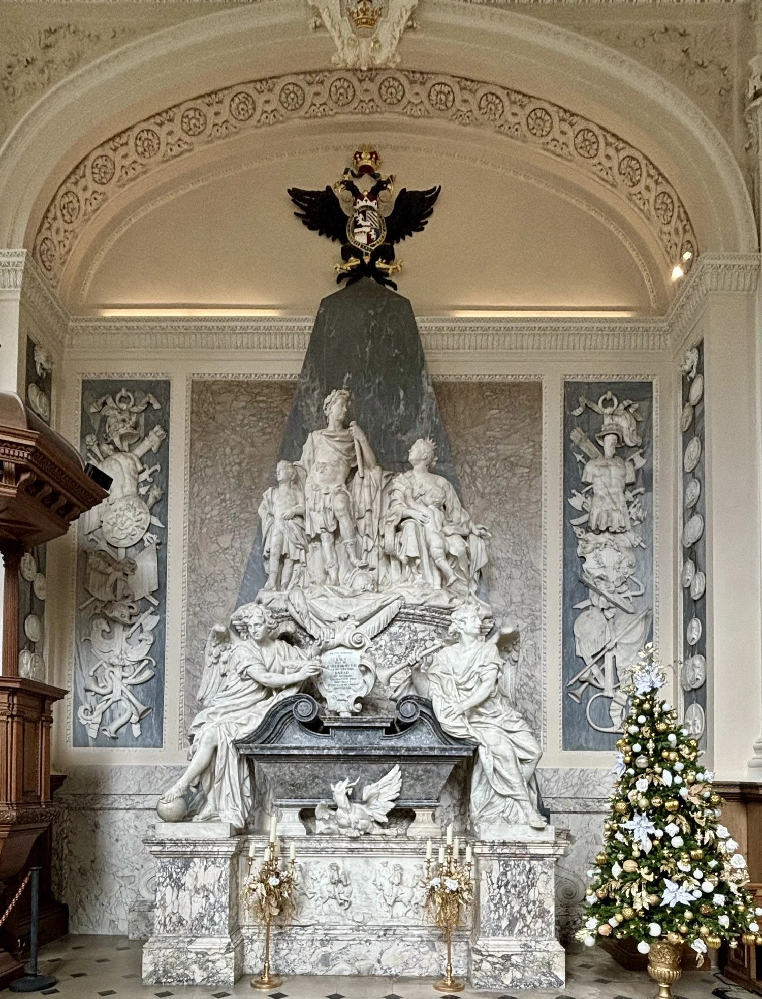 This is the monument designed by Sarah for her husband John Churchill, first Duke of Marlborough, descendant of the Drakes of Musbury. He died in 1722 and Sarah followed in 1744. Both are buried at Blenheim.
