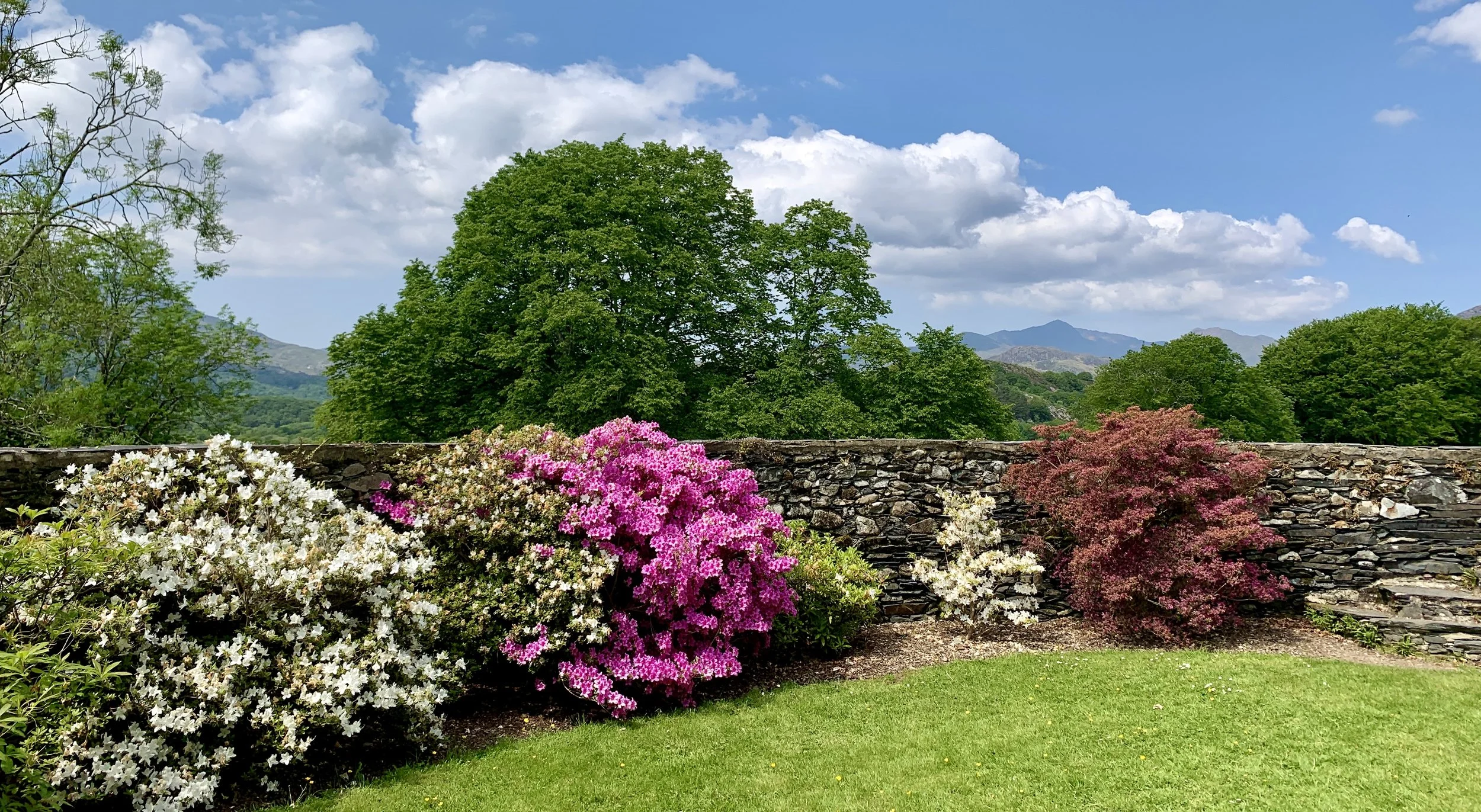 I visited in May, when the rhododendrons and azaleas were in full bloom, their colours blazing against the dark greens of clipped hedges and yews. It is a garden of contrasts: bright flowers set against strong structure, long vistas framed by stone walls and topiary.